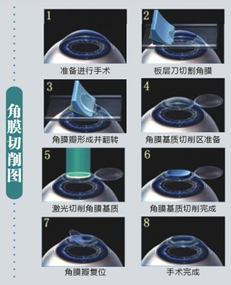 LASIK手术的原理是用一种特殊的精密的微型角膜板层切割系统(简称角膜刀)将角膜表层组织制作成一个带蒂的圆形角膜瓣,翻转角膜瓣后,在计算机控制下,用准分子激光对瓣下的角膜基质层拟去除的部分组织予以气化,然后于瓣下冲洗并将角膜瓣复位,以此改变角膜前表面的形态,调整角膜的屈光力,达到矫正近视、远视或散光的目。