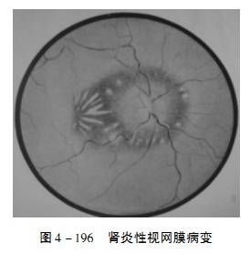 3、视网膜病变基本与高血压眼底改变相似,也可分为四期。如果发现视网膜棉絮状渗出或视乳头水肿,则预后较差(图4 - 196)。