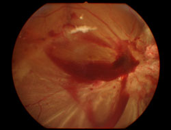 2、裂隙灯及前置镜检查可发现玻璃体内有鲜红或混黄变性的血影细胞。